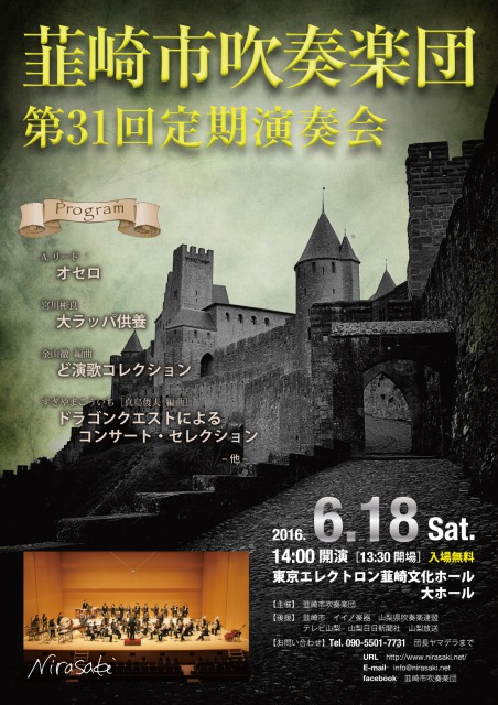 韮崎市吹奏楽団第31回定期演奏会です。吹奏楽のオリジナル曲からど演歌まで、いろんな曲を演奏いたします。