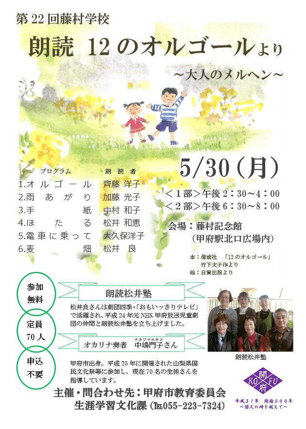 « すべてのイベント このイベントは終了しました。 第22回藤村学校 朗読12のオルゴールより~大人のメルヘン~ 2016年5月30日(月) « 529(こうふく)マルシェ ~こうふのミリョクがぎゅっ!~ オカリナ無料体験会&ミニコンサート » Tweet 日時/5月30日(月) 1部 14:30~16:00 2部16:30~20:00 場所/甲府駅北口 藤村記念館 講師/朗読松井塾 定員/70人 ※参加無料。事前申込不要 お問合せ/生涯学習文化課 055-223-7324 + Google カレンダー+ iCal エクスポート 詳細 日付: 2016年5月30日(月) イベントカテゴリー: 舞台・音楽・ライブ